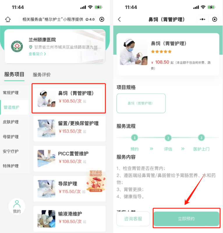 第二步:选择“您需要的护理服务”后点击“立即预约”。