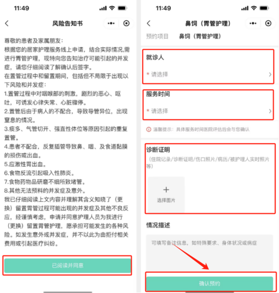 阅读“风险告知书”,并点击“已阅读并同意”,后填写服务信息(初次使用,需“新增就诊人”,并按提示填写相关信息),并点击“确认预约”。
