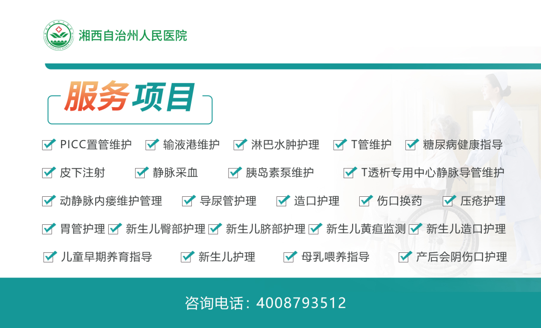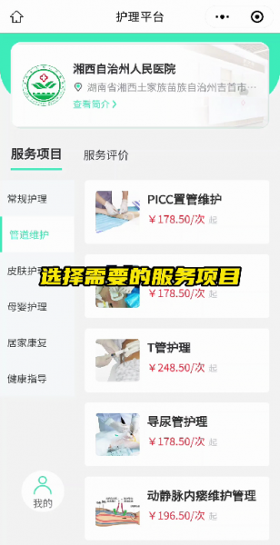 目前,医院已上线的服务项目有:PICC置管维护、输液港维护、淋巴水肿护理、T管维护、糖尿病健康指导、皮下注射、静脉采血、胰岛素泵维护、T透析专用中心静脉导管维护、动静脉内瘘维护管理、导尿管护理、造口护理、伤口换药、压疮护理、胃管护理、新生儿臀部护理、新生儿脐部护理、新生儿黄疸监测、新生儿造口护理、儿童早期养育指导、新生儿护理、母乳喂养指导、产后会阴伤口护理,无论是老年人、康复群体,还是其他需要延续护理服务的患者,都能在家中享受到与医院同等质量的护理服务。