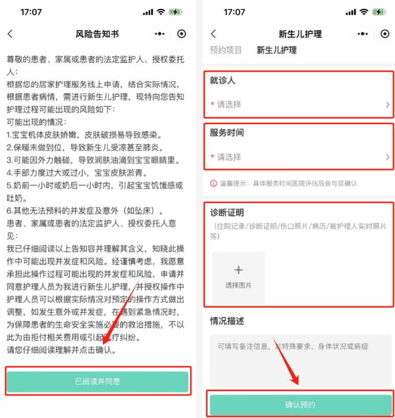 步骤三:阅读“风险告知书”,并点击“已阅读并同意”,后填写服务信息(初次使用,需“新增就诊人”,并按提示填写相关信息),并点击“确认预约”。
