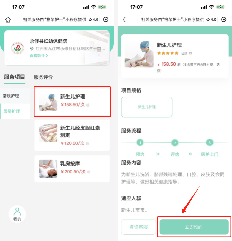 微信关注“永修县妇幼保健院”公众号→点击“就诊指南”→“护理到家”。