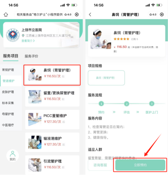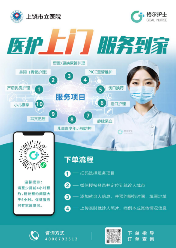 方法1:微信关注“上饶市立医院”公众号→点击“互联网医院”→“优护到家”。