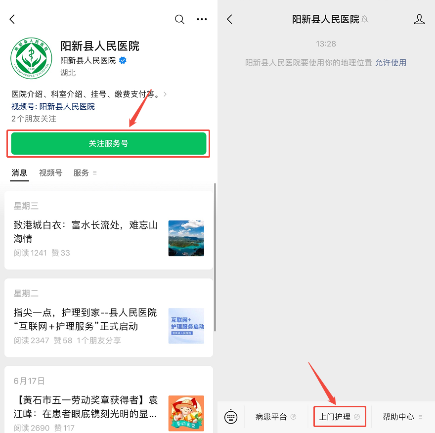 方法1:微信关注“阳新县人民医院”公众号→点击“上门护理”。