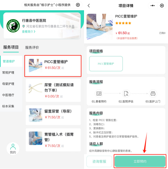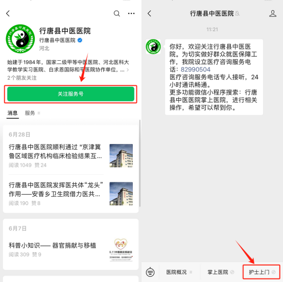 方法1:微信关注“行唐县中医医院”公众号→点击“护士上门”。