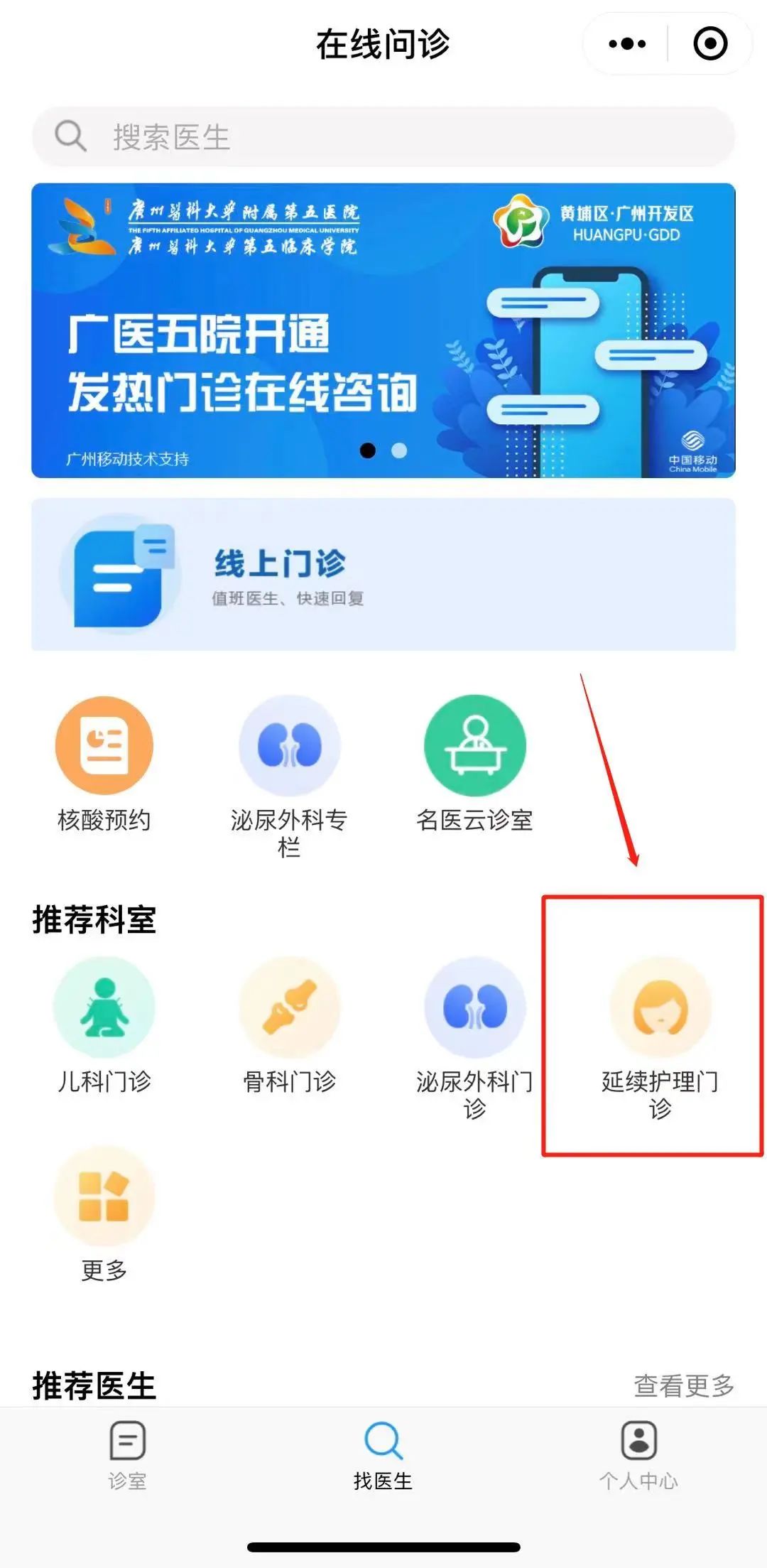 除了互联网护理服务外,有需要的患者还可在“广医五院”微信公众号,预约“延续护理门诊”,到院享受专科护理治疗服务。