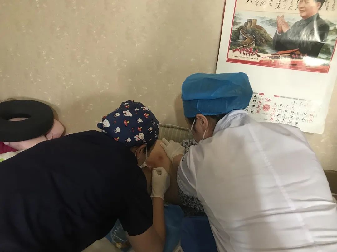 接到订单后,唐卉护士长经过审核,与伤口治疗专科护士郑丽娜一同前往患者家中,为周阿姨做治疗。