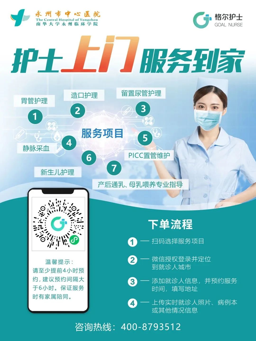 关注微信公众号“永州市中心医院”,点击底部菜单栏“个人查询”-“上门护理”进行预约。