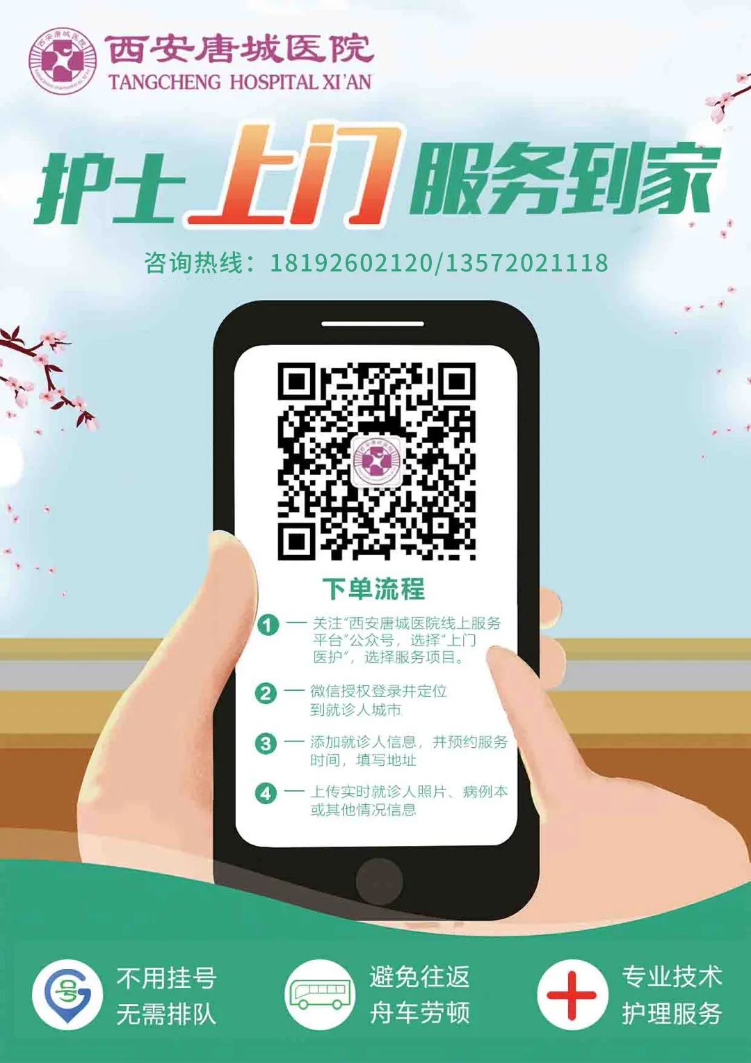 微信关注公众号“西安唐城医院线上服务平台”,点击底部菜单栏“上门医护”进行预约:
