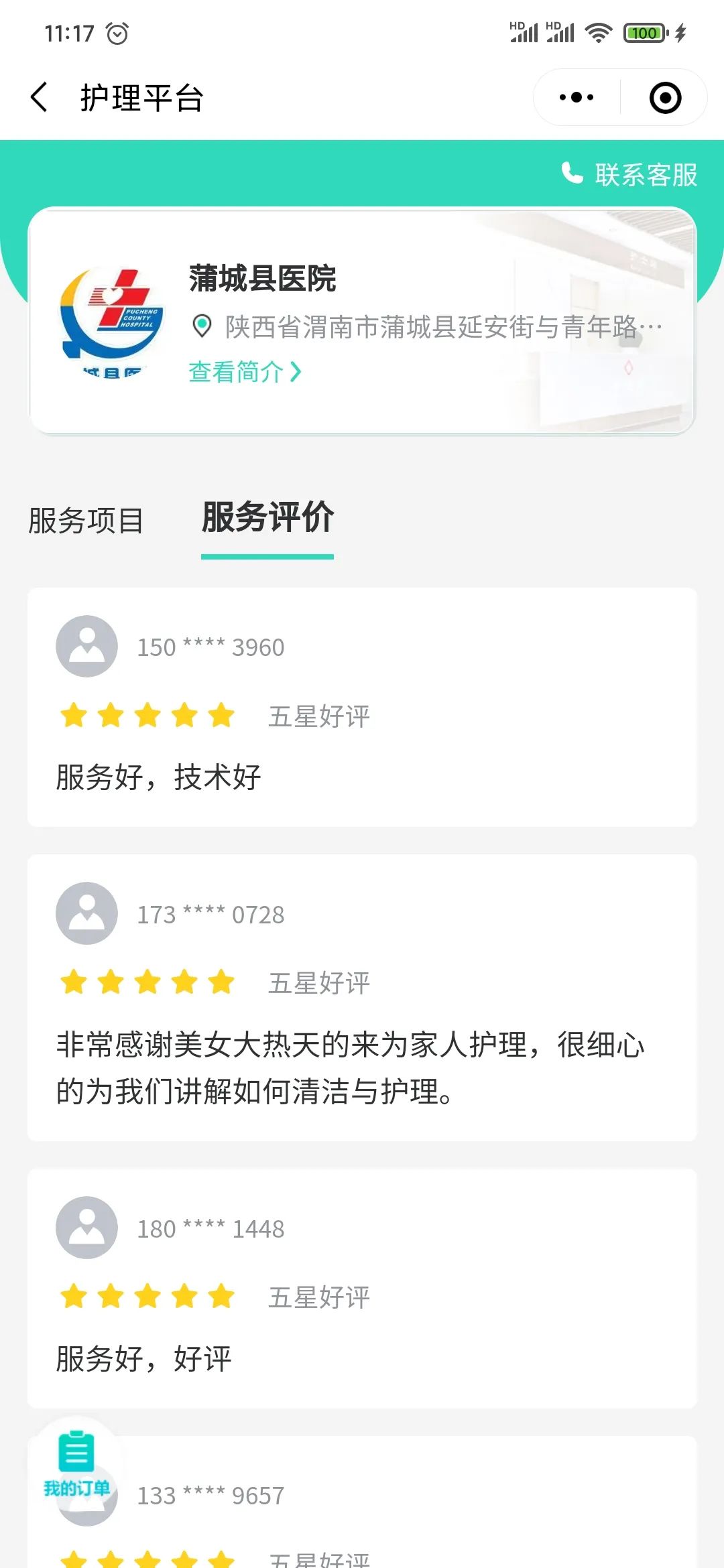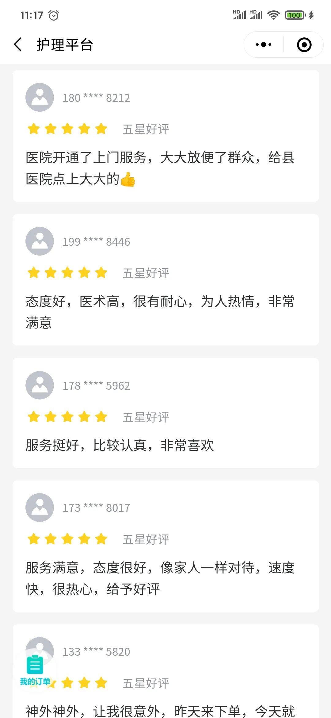 还有很多用户并没有留下只言片语,而是用一个个五星好评来肯定医护人员的辛勤劳动。上线一年多以来,蒲城县医院“互联网+护理服务”团队用实际行动赢得了广大蒲城百姓的支持和赞许。