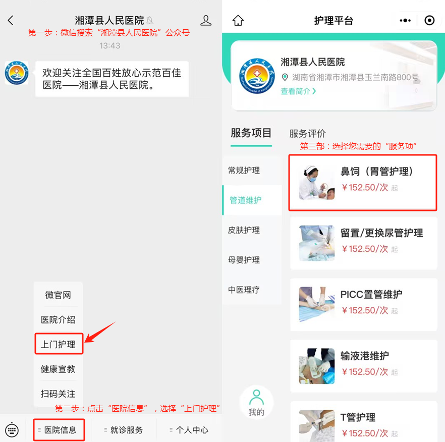关注“湘潭县人民医院”微信公众号,点击底部菜单栏“医院信息”-“上门护理”,进入格尔护士平台,选择“需要的服务项”进行预约。