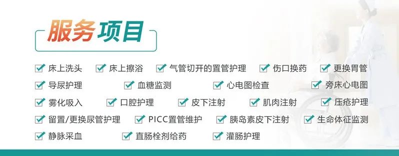 目前,医院已开通的上门护理服务包括:床上洗头、床上擦浴、气管切开的置管护理、伤口换药、更换胃管、导尿护理、血糖监测、心电图检查、旁床心电图、雾化吸入、口腔护理、皮下注射、肌肉注射、压疮护理、留置/更换尿管护理、PICC置管维护、胰岛素皮下注射、生命体征监测、静脉采血、直肠栓剂给药、灌肠护理等多个方面,全方位满足患者的多样化需求。