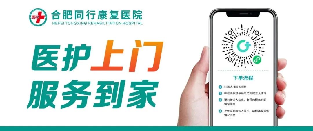 微信关注“ 合肥同行康复医院有限公司”公众号,点击底部菜单栏“走进同行”,点击“医护上门”,进入格尔护士平台,选择“需要的服务项”进行预约。