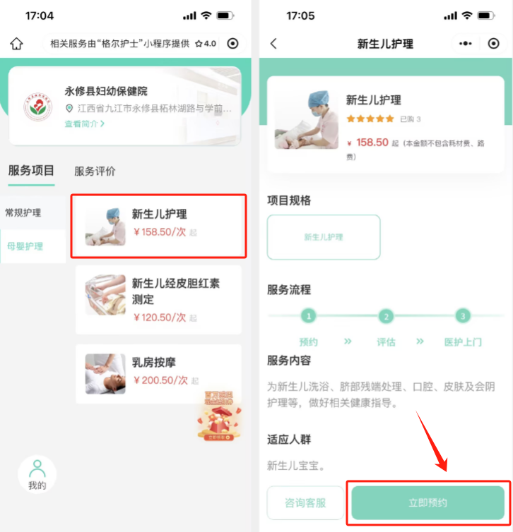 第二步:选择“您需要的护理服务”后点击“立即预约”。