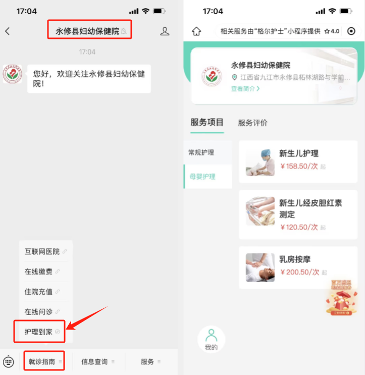 第一步:微信关注“永修县妇幼保健院”公众服务号→点击“就诊指南”→“护理到家”进入格尔护士平台。