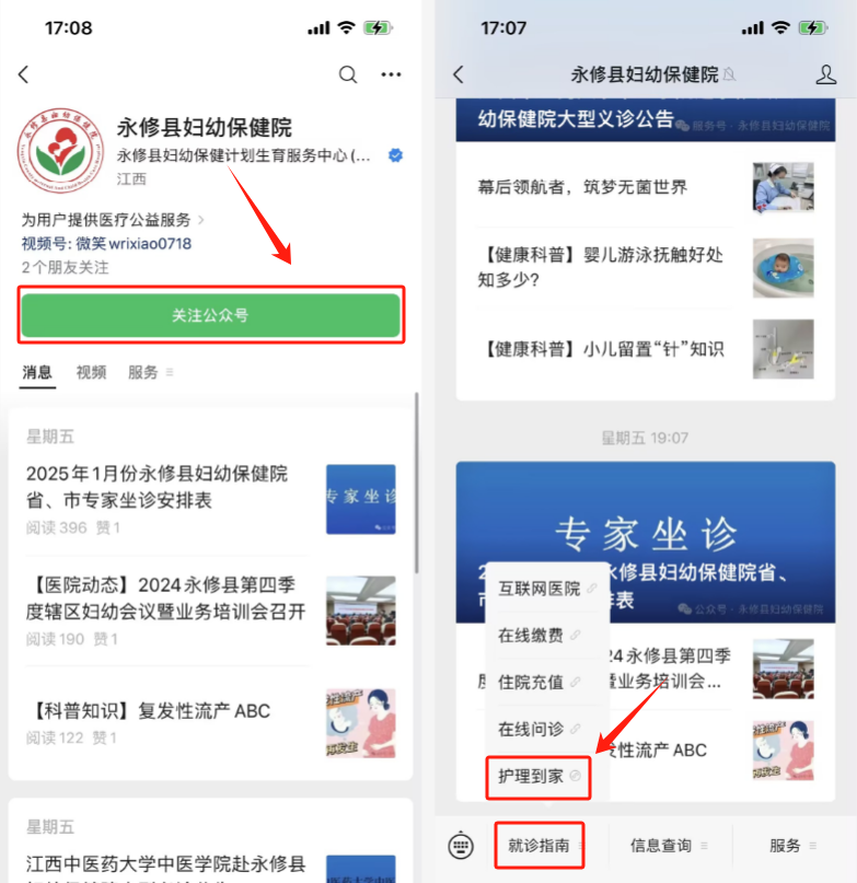 微信关注“永修县妇幼保健院”公众号→点击“就诊指南”→“护理到家”。