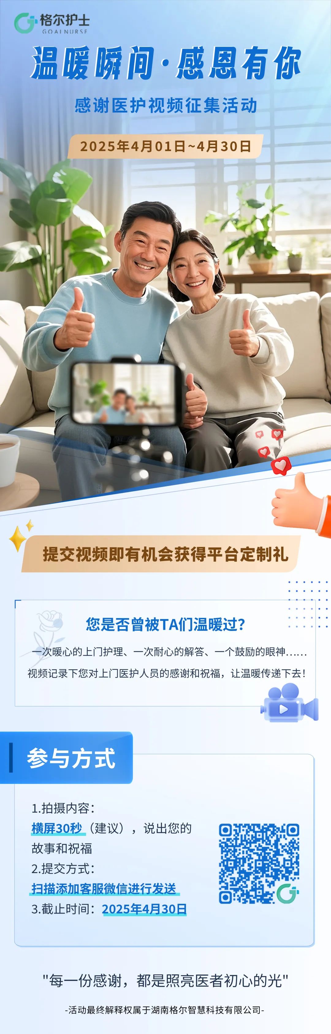 格尔护士 专业护士上门护理 格尔护士 热门文章 【4月暖心行动】用你的镜头,讲述护士守护的故事 | 格尔护士感恩视频征集 格尔护士 格尔护士 活动 闪耀天使 守护健康 感恩视频征集 白衣天使的脚步迈进家门,如同曙光点亮了健康的希望! 他们曾在深夜为患者换药,用轻声细语抚平生病的焦躁;他们曾在危急时刻挺身而出,用专业托起生命的重量;他们或许不善言辞,却用日复一日的守护,织就了无数个家庭的安康——这就是护士,用平凡书写伟大的「生命摆渡人」。 这个四月,格尔护士平台发起「闪耀天使 守护健康」感恩视频征集活动,诚邀您举起手机,记录那些与医护人员相处的暖心瞬间。无论是一段康复后的真情告白,还是深夜上门服务的感动定格,您的故事,都值得被全世界看见! 【故事灵感库】 我父亲卧床3年多了,每个月都需要更换导尿管1-2次,快4年来,护士上门确实对于行动不便的人很方便,蔡护士长服务态度很好,不怕脏不怕累,耐心细致,非常感谢她们! "张护士连续3个月上门教我爸做康复操,现在他能自己走路了……" 我爸8月20号从ICU出院,因为插了胃管和尿管,每半个月就需要更换管子。很感谢有这个平台,给我们提供了便利。 "那天孩子高烧惊厥,李护士5分钟就赶到家里,她的冷静救了我们全家……" "王护士总记得我奶奶爱吃梨膏糖,每次来护理都会带两颗,说'甜了心情就好得快'……" 您的故事不必轰轰烈烈,真实的声音最具力量。那些藏在细节里的关怀,那些用专业筑起的生命防线,都值得被郑重记录。 【即刻行动,让感恩永不迟到】 在生命的旅途中,医护是照亮黑暗的星辰,患者是见证温暖的同行者。这个春天,让我们用影像定格感动,用感恩连接彼此。 期待您镜头里的天使故事,让爱与感谢,生生不息! END 格尔护士作为深耕护理行业十余年的“上门护理”服务平台,与全国数千家医院合作,为老百姓提供专业、放心的上门护理服务。服务涵盖常规护理、管道维护、母婴护理、中医理疗、居家康复、特殊护理等六大类300多个项目,覆盖全国31个省市及地区,让您居家也能享受到5年以上临床经验的专业护士上门护理。仅需手机点一点,省时省力又省心,上门护理就找格尔护士! 咨询热线:400-8793-512 “格尔护士”居家护理服务平台 预览时标签不可点 微信扫一扫关注该公众号 知道了 微信扫一扫 使用小程序 取消 允许 取消 允许 × 分析 微信扫一扫可打开此内容,使用完整服务 : , , , , , , , , , , , , 。 视频 小程序 赞 ,轻点两下取消赞 在看 ,轻点两下取消在看 分享 留言 收藏 听过